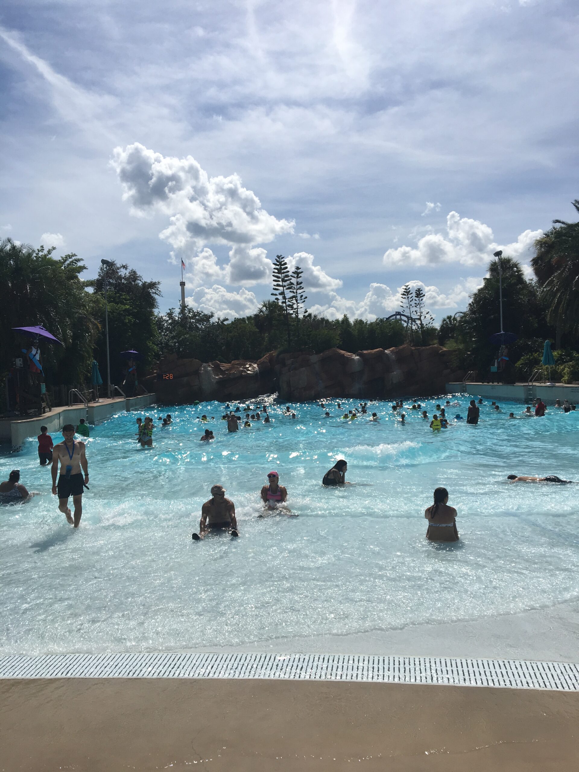 The main area (in the middle of the park) has the beach with the loungers and the wave pools. The waves go at intervals – Its announced and theres a timer for when the waves are due to start in case you need to make a quick exit!